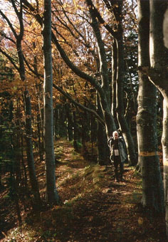 Immer wieder ziehen Nebelfetzen daher, welche sich in der Sonne auflösen. Die Maisernte ist zwar lange zu Ende, aber die Binkel liegen in weißer und grüner Folie eingeschweißt auf den Wiesen, abholbereit für den Winter…es ist das Futter für die Kühe. Wir müssen die Wetterluke queren und tauchen tief in das Nebelbecken ein, bevor wir wieder steil bergan müssen. In „Luft“ holen wir uns in einem Gasthaus den Wanderstempel und ich trinke auch gleich einen gespritzten Apfelsaft. Wir genießen die Sonne, und rasten uns ein wenig vom Auf und Ab aus. Da die meisten Etappen sehr lang sind, müssen auch unsere Rastpausen sehr kurz ausfallen. Für die kurzen Tage des Herbstes sind sie fast zu lang. Meist sind wir im Höllentempo mit sehr raschen Schritten unterwegs und vergönnen uns kaum Trinkpausen. Nur eine Viertel- manchmal eine Halbe Stunde Mittagspause steht jeden Tag auf dem Programm. Diese Mittagspausen verbringen wir meist auf einem Bankerl, sofern eins zu finden ist.